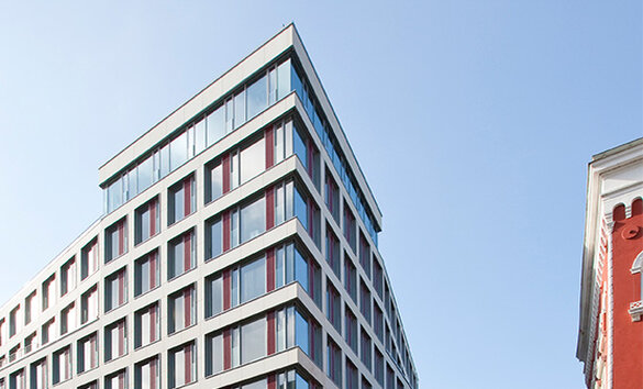 Zentral in der Hamburger Altstadt hat HOCHTIEF Projektentwicklung das Büro- und Geschäftshaus conSENSE7 mit insgesamt 8.500 Quadratmetern Bruttogrundfläche realisiert. Der ehemalige Sitz der Hamburger Feuerkasse wurde durch einen Neubau mit acht Regel- und einem Staffelgeschoss ersetzt. Die transparente Stein-Loch-Fassade ist umgebungsgerecht in der Leitfarbe Rot gehalten und bietet beste Lichtverhältnisse. Jedes der Obergeschosse ist mit Balkon oder Terrasse ausgestattet.